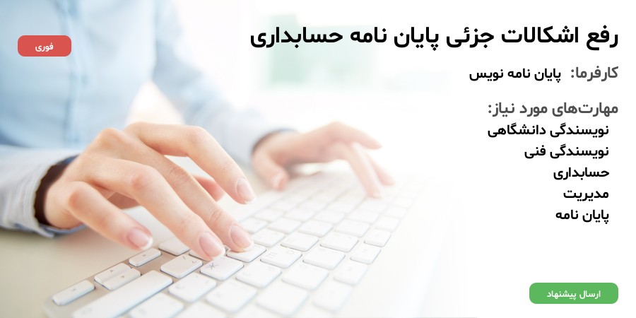 پایان نامه ای که باید روش اصلاحات انجام شود پایان نامه خانم امیری هست یه پایان نامه هم به عنوان نمونه فرستادم ساختار پایان نامه باید مثل اون باشه و سوالات و فرضیه های پایان نامه به مالی و مرتبط با صورت های مالی باشه و خواهش می کنم اگر تخصص دارید پیشنهاد بدین مهلت یک هفته و پس از تایید استاد وجه ازاد میشه