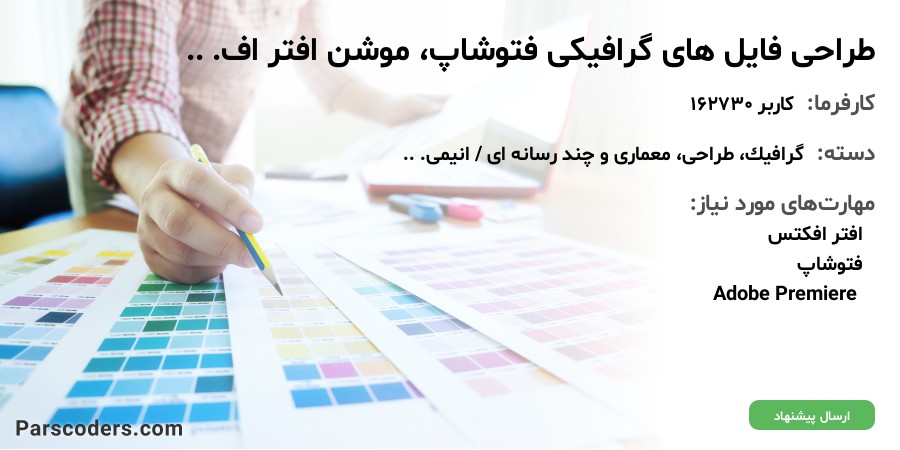 یک پروژه دارم که باید چند قالب فتوشاپ طراح بشه، موشن گرافیک انجام بشه و طراحی لوگو و تایپو لطفا نمونه کارهای خودتان را ارسال کنید.