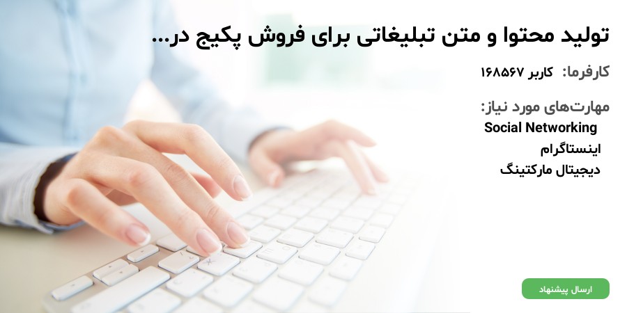 برای تبلیغات در شبکه های اجتماعی جهت فروش پکیج درسی ، به یک نفر کاربلد در زمینه تبلیغ در شبکه های اجتماعی و تولید متن و محتوای تبلیغاتی مانند پوستر و بنر و گیف و ویدیو و .. نیاز دارم ، تبلیغات رو خودم رو کانال هایی که مد نظر دارم رزرو میکنم ، فقط برای تولید بنر ها و پوستر ها یک نفر میخام