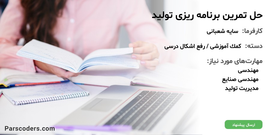 سلام.یک تا حداکثر سه تمرین،از تمرینهای اخر فصل باید حل بشه هر کدوم از شماره سوالات باشه فرقی نمیکنه(از فصل دوم برنامه ریزی تولید اریانژاد؛شما پیشنهاد رو بذارید در اولین فرصت اپلود میکنم pdf کتاب رو)