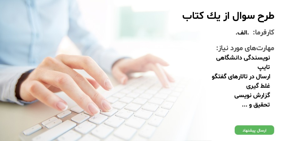 سلام وقت بخير. براي يه پروژه ي آن لاين نياز داريم شخصي از توي آموزشي که در سايت قرار گرفته (در زمينه رانندگي) برامون نمونه سوال درست کنه. نمونه سوالات به صورت آن لاين بايد درست بشه.آموزش لازم داده مي شه.سوالات به صورت تستي ، درست و غلط هست. سطح سوالات بايد ترکيبي از آسون و سخت باشه و همينطور براي هر سوال بايد يک توضيح در حد يک خط نيز نوشته بشه . دوستاني که مايلند لطفا مبلغ مورد نظرشون رو براي ساخت 100 سوال وارد کنند. هر سوالي بود لطفا از طريق پيام خصوصي بفرماييد.