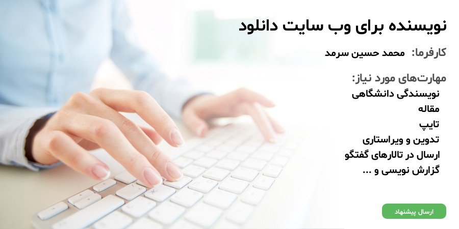 سلام خدمت دوستان عزيز . براي وب سايت دانلود در حال توسعه پارميشا به نشاني Parmisha.com نياز به نويسنده ي دانلود داريم . دانلود نرم افزار ، بازي و نرم افزارهاي اندرويد ، مک ، لينوکس و همچنين انيميشن شرايط : 1 - دارا بودن VPS ويندوز براي دانلود و فشرده سازي فايل ها بر روي سرور مجازي و آپلود از طريق FTP اختصاص داده شده به نويسنده بر روي سرور اصلي . 2 - نوشتن توضيحات اختصاصي . ( کپي از ديگر وب سايت ها به هيچ هنوان مورد پذيرش نيست ) 3 - آشنايي با وردپرس و نحوه ي نوشتن و درج محتوا در وردپرس و درج کلمات کليدي براي ماه نخست به ازاي هر پست 1500 تومان پرداخت مي شود و از ماه آينده با توجه به رشد وب سايت و آناليز فعاليت هاي نويسنده ، دستمزد پرداختي افزايش مي يابد .
