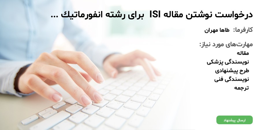 با سلام و خسته نباشيد خدمت مجريان عزيز. از دوستاني که توانايي نوشتن مقاله ISI در زمينه انفورماتيک پزشکي رو دارن درخواست ميکنم موضوع مقاله و زمان مورد نياز براي انجام اين کار رو اعلام کنند. ضمن اينکه مقاله حتما بايد با ايمپکت فکتور حداقل 1 اکسپت شود تا معتبر باشد و تسويه حساب با مجري محترم بعد از اکسپت مقاله انجام ميشود.