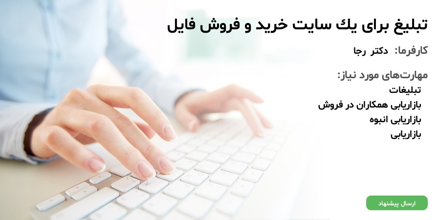سلام من يک سايت خريد و فروش فايل دارم که مي خوام تبليغات وسيعي براي اون انجام بشه اين تبليغ ميتونه شامل تبليغ دستي در سايت ها و وبلاگ ها باشه تبليغات با اسمس ايجاد بک لينک در سايت ها با رتبه بالا و راه هاي ديگه براي افزايش ثبت نام در سايت و افزايش تعداد بازديدکنندگان باشه يا هر راه ديگه اي که به ذهنتون ميرسه کساني که سايتي با پيج رنک بالا دارند نيز پيشنهاد قيمت خود را براي قرار دادن تبليغات سايت در سايت خودشون بدن کساني که ميخوان پيشنهاد بدن آدرس سايت را بهشون ميدم ممنون