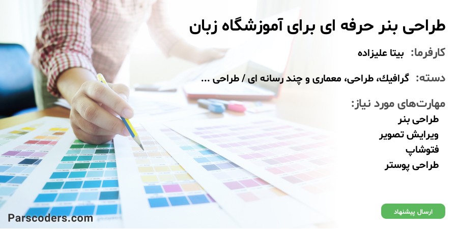 برای یه موسسه آموزش زبان بنر تبلیغاتی حرفه ای و جذاب میخواستم. لطفا دوستانی که نمونه کار قوی دارن پیشنهاد بدن. بعد از شروع کار راجب جزئیات پروژه توضیحات بیشتری میدم. اگر بتونید تو سایز های مختلف طراحی کنید یک مزیت محسوب میشه. خیلی ممنون