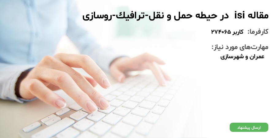 سلام بصورت فوری نیاز به مقاله در زمینه روسازی-حمل و نقل وترافیک و شهر هوشمند دارم، در صورت وجود و کار در این موارد برای همکاری یا درج نام اطلاع دهید(جایگاه 2ونهایتا3)