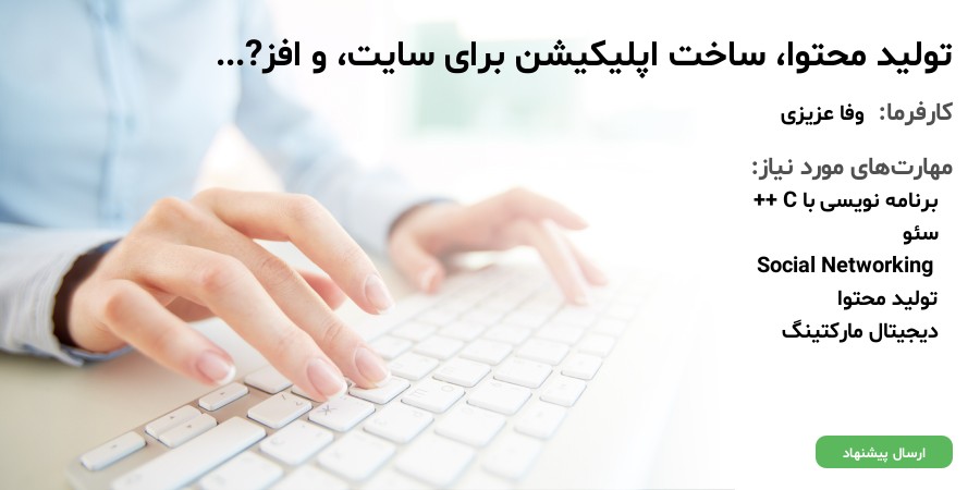 ۱- تولید محتوای روزانه از بین فریلنسرها لازم هست. داشتن مهارت در سئو اصله گرچه خودمون آموزش میدیم.