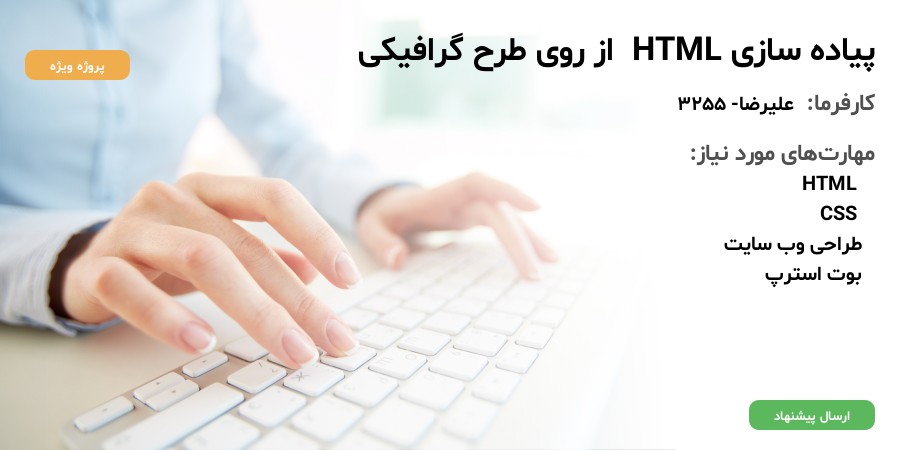 پروژه درخواستی پیاده سازی HTML از روی طرح گرافیکی است که این طرح داخل برنامه zeplin و یا به صورت pdf قابل ارائه است . در برنامه zeplin تمامی css های بخش های گرافیکی به صورت جداگانه قابل دریافت است و همچنین عکس ها به صورت جداگانه قابل دانلود هستند. نکته مهم این است که اصول طراحی HTML در آن رعایت شود و Bootstarp برای استایل ها استفاده شودو قابلیت ریسپانسیو هم داشته باشد.