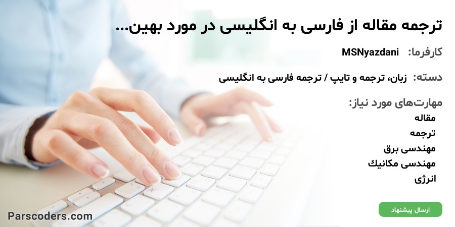 با سلام خدمت فریلنسرهای گرامی 1- متنی به فارسی موجود است که نیاز به ترجمه انگلیسی آن می باشد. 2- ترجمه متن با هدف ارسال به مجلات ISI است لذا نیاز به ترجمه تخصصی در سطح عالی می باشد. 3- متن فارسی مرتبط با رشته مهندسی مکانیک (سیالات، تبدیل انرژی) بوده و محتوای آن در مورد سیکل تولید برق و حرارت به کمک پیل سوختی و سوخت بیوگاز است. 4- نمونه ای از متن در ادامه پیوست شده است. تعداد تقریبی لغات کل متن، ده هزار تا است. 5- مدت زمان تحویل ترجمه 8 روز است. با این حال ترجمه در روزهای کمتر، برتری چندانی ندارد و کیفیت کار نهایی مهم است. 6- حتی الامکان لطفا در صورتی که با موضوع آشنایی دارید، پیشنهاد بفرمایید. 7- قیمت پیشنهادی بنده به ازای هر لغت 200 تومان است. 8- پروژه بخش بندی شده و هر بخش بعد از ترجمه شدن دریافت می شود تا ارزیابی کیفی کار برای ادامه ترجمه صورت گیرد. در صورتی که در هر بخش، کیفیت ترجمه مناسب نباشد، ادامه ترجمه و ادامه قرارداد لغو می شود. البته حق الزحمه بخشهای ترجمه شده بعد از اصلاح از طرف مترجم محترم و رضایت از کار پرداخت خواهد شد. 9- لطفا در صورت تمایل برای ارائه پیشنهاد برای این پروژه، نمونه متن کوتاه پیوست شده را ترجمه بفرمایید تا توانایی شما برای ترجمه این متن، سنجیده شود. 10- دوستان عزیز سعی شد توضیحات، کامل باشد تا بتوانید بهتر تصمیم بگیرید و وقت ارزشمندتان بیهوده صرف نشود. با احترام
