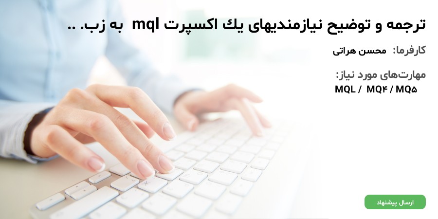 سلام دوستان.من خودم یک برنامه نویس mqlهستم.منتهی انگلیسیم خیلی خوب نیست.یک پروژه برام فرستادن که متنش انگلیسیه .خوب نمیفهمم بعضی جاهاش رو.نیاز به یک برنامه نویس دیگه که انگلیسیش هم خوب باشه دارم تا برام ترجمه کنه.کلا نیم ساعت هم شاید وقت نگیره اینکار.فقط میخوام کامل توضیح بده.توضیحات حتی الامکان به صورت ویس باشه.