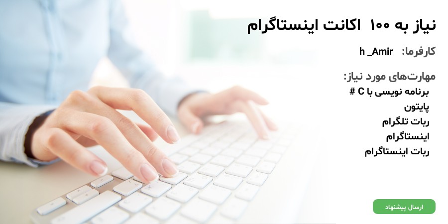 نیاز به ۱۰۰ اکانت اینستاگرام حداقل ۳ روز از ساخت اکانت ها گذشته باشه به همراه ۵ فالوینگ از افراد مشهور و ۱ پست