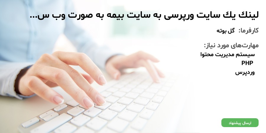 با سلام . من يه سايت بيمه با وردپرس کار ميکنم که مي خوام يکي از صفحاتي که ميزارم تو سايت به صفحه ي بيمه آسيا متصل بشه . به عبارت ديگر حتماً تا حالا ديديد که يه سايتي هست که تو کار بيمه هست (نمايندگي) داره و يه برگه داره با نام محاسبه ي نرخ بيمه نامه شخص ثالث يا محاسبه نرخ بيمه نامه عمر و ... ميخوام ببينم اين کار را برام با چه تعرفه اي انجام ميديد . البته اين قيمتي که من تعيين کردم شايد ناچيز باشه ولي تنها يه برگه نيست خدمات بيمه اي ک توي سايتم ميزارم و بايد به سايت بيمه متصل باشه زياده . لطف کنيد قيم پايين بديد تا در دفعات بعدي با هم کار کنيم . لطفاً دوستاني که آشنايي کامل به وردپرس و زبان php دارن پيشنهاد بدن و بعد از تست مبلغ واريز خواهد شد . با تشکر