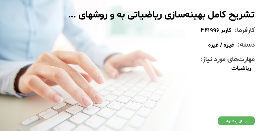 سلام ، نیاز به یک گزارش کامل در زمینه تشریح بهینه سازی(optimization) ریاضیاتی و روش های بهینه سازی به همراه حل مسائلی برای هرکدام از روش های برای تفهیم بهتر موضوع . (فقط از طریق فرمول های ریاضی نه از روش حل به وسیله نرم افزار )