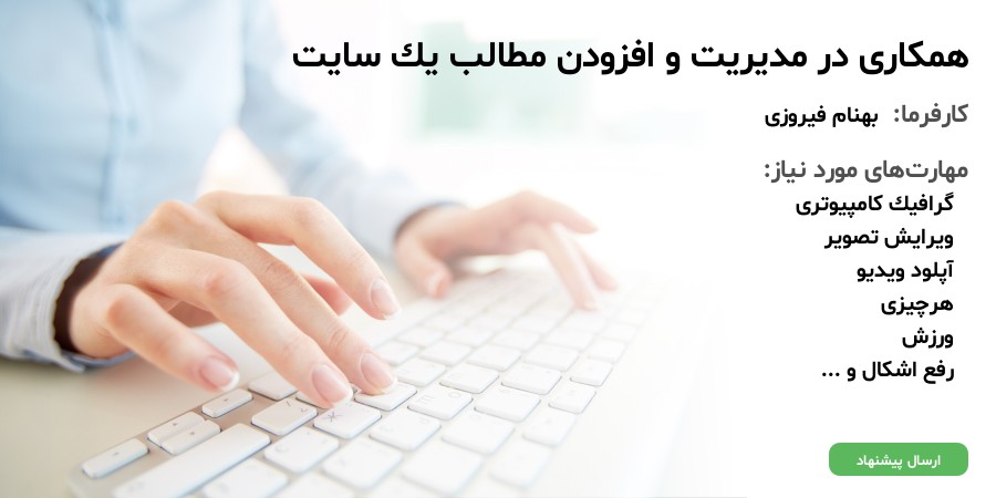 نده نياز به يک شخصي دارم که در ابتدا تا حدودي آشنايي با نرمازار هاي ويرايش فيلم و عکس مثل کورل و فتوشاپ و يا ويرايشگري که باهاش راحت تر هست.. داشته باشه و تا حدودي هم با نرم افزار اف تي پي براي اپلود فايل تو سايت شماي کلي کار اينطوريه که يه سايت ورزشي داريم مدير واسه بخش مالتي مدياش ميخوايم کار سختي هم نيست يه بخش خبري تلويزيون ايران مثلن اخبار ورزشي رو بهتون ميگم شما کارتون اينه که اون رو ضبط کنيد از تلويزيون هر روز تو همون ساعتي که بهتون ميگم و سريعان اقدام به کات کردن خبرها کرده لوگوي سايت رو هم ميزاريد و توي سرور اپلود مي کنيد و خبر مربوط بهش روي توي سايت درج ميکنيد... خيلي ساده هست... البته مراحل کامل مربوطه رو هم بنده برايتون يه بار فيلم ميگيرم و بهتون اموزشش رو ميدم که ببينيد يه دور هم بايد کله خبرا رو به صورت کامل اپ کنيد نکته: در ضمن يه اينترنت با سرعت متوسط رو ب بالا هم خعلي مهمه... البته کله يه اخبار 15 دقيقه بيشتر نيست و يه فرمت هايي بهتون ميگم که حجم بياد پايين... در کل کار لذت بخشي هست اگر سوالي خواستيد نکته هست اززم بپرسيد پولش رو هم ماهيانه ميدم - ماه ب ماه... لدفن پيليز : خواهشان مبلغي که براتون ميصرفه رو قيمت رقابتي بگيد نياين پيام بدين نظر منو بپرسيد!!! اينجا سايت فريلنس هست شما بايد قسمت بدين!!! هر کاري قيمت مناسب تري داشته باشه قاعدتان قبول ميشه در ضمن چند روز اول تسته که کارو بي نقص انجام داديد همون تست هم جزو کارتون حساب ميشه هزينه اونم ميدم...