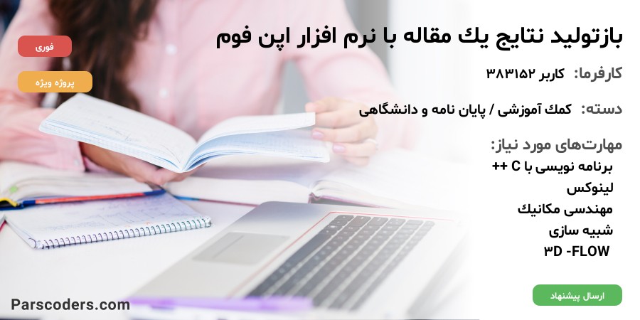 سلام. من یک مقاله در مورد استفاده از بادگیرها در کاهش آلاینده های شهری دارم که باید نتایج و نمودارهای این مقاله رو اعتبار سنجی کنم و دوباره به دست بیارم. هندسه شکل آماده است. نرم افزار مورد استفاده اپن فوم هست. مدل توربولانسی k-e است. من میخوام که بعضی نمودارهای مقایسه نتایج عددی با تجربی که در این مقاله آمده گرفته بشه. مقاله رو بارگزاری کردم. همه نمودارها نیاز نیست که گرفته بشن. بعضی از آنها مورد نیازه. هندسه شکل رو در اختیار میذارم. مقاله مورد نظر رو هم پیوست کردم. مش مورد نیاز در حدود ۲.۵ میلیون است. فقط نیاز به بازتولید دو نمودار از مقاله دارم.