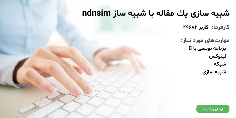 شبیه سازی یک مقاله با سناریو شبکههای NDN، که با NDNSIM انجام شود و انجام رفع اشکال برای موارد مربوط به اجرا یا قطعه کد که درباره ی آن ها سوال وجود دارد. خواهشمند است دوستانی که توانایی شبیه سازی با ndnsim را دارند اعلام آمادگی کنند. مبلغ انجام پروژه توافقی است و مهلت آن نیز در صورت نیازتا چند روز افزایش می یابد.