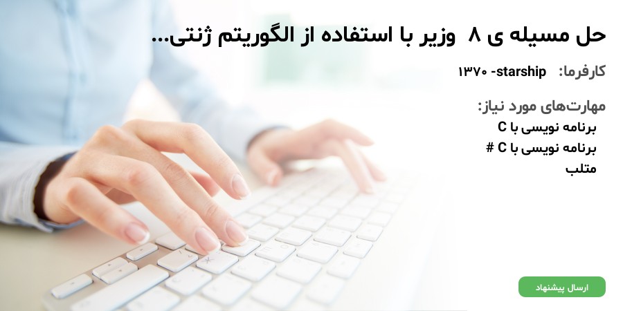 یه پروژه ی خوب واسه حل مسیله ی 8 وزیر با الگوریتم ژنتیک میخوام،یا با ++c یا با c یا با # c یا هم متلب.