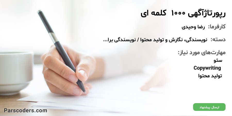 برای رپورتاژ اگهی 1000- کلمه ای در مورد موضوع "خرید و فروش بنر ضایعات،بنر باطله،بنر دست دوم " جهت درج در سایت شرکت ،سایت های نیاز روز و بانک های اطلاعاتی از یک کارشناس و متخصص تولید محتوا که حایز این شرایط باشد،دعوت به همکاری می گردد: مسلط به سئو و محتوا نویسی سایت، تسلط و تجربه کاری در حوزه تبلیغات دیجیتال،خلاقیت زیاد درامر نویسندگی،توانایی نگارش ادبی و بالا بودن دایره لغات، آشنایی با مفاهیم سئو،منظم و متعهد بودن و داشتن برنامه ریزی مشخص برای تولید محتوا، آشنا با ادبیات تبلیغات نویسی و مفاهیم،علاقه داشتن به کار.