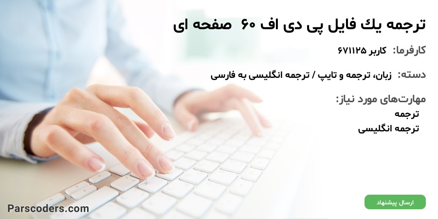 سلام یک فایل پی دی اف ۶۰ صفحه ای بااصطلاحات پزشکی هست که باید ترجمه بشه (انگلیسی به فارسی) و در آن اصطلاحات پزشکی هم هست به همراه جداول نمودار ها و شکل های مختلف که همگی باید ترجمه بشه حتی پاورقی ها و .. و در نهایت به صورت فایل ورد و پی دی اف تحویلی داده شود. فونت لازم و سایز فونت رو در صورت همکاری به همراه موارد دیگری که باید رعایت بشه بهتون میگم این فایل فایل ترجمه سمینار و پروژه هست ترجمه باید کاملا مفهومی و دقیق باشه نگارش هم باید دقیقا شبیه خود پی دی اف باشه یک فایل پی دی اف نمونه ترجمه هست که اگر لازم بدونید میفرستم تا با نحوه ترجمه آشنا بشید در شروع کار هم حتما یک صفحه به صورت نمونه ترجمه بشه بعد ادامه کار رو پیش میبریم.