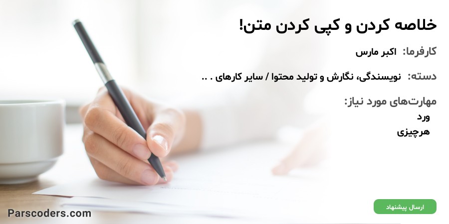 سلام. من یه کتاب 450 صفحه ای رو باید در 45 صفحه خلاصه کنم. حدود 18 صفحه رو خودم نوشتم. شما بی زحمت 27 صفحه بعدی رو بنویسید. کار زیادی قرار نیست انجام بدید . فقط متن سر تیتر های مهم رو کپی می کنید داخل ورد. می پذیرید؟ قیمت پیشنهادی تون؟ من 100 هزار تومان در نظر گرفتم.