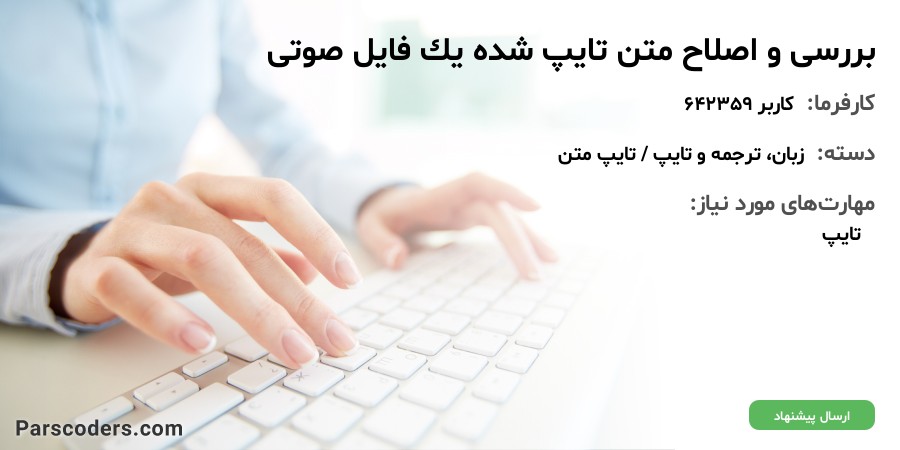 سلام وقت بخیر. یک فایل صوتی دارم و یک متن تایپ شده. مدت زمان فایل صوتی یک ساعت و ده دقیقه هست. می خوام یک نفر بشینه این فایل رو دقیق و کامل گوش بده و اگر احیانا کلماتی توی متن جا افتاده تصحیح کنه. البته متن دقیق تایپ شده اما باز هم نیاز به بازبینی داره.