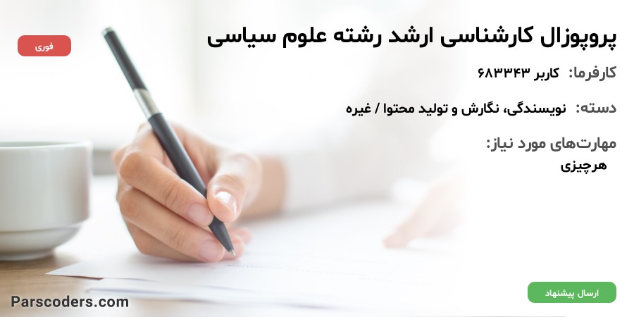 با سلام درخواست نوشتن پروپوزال با موضوع بررسی تطبیقی رویکرد غرب به برنامه هسته ای کشورها (مطالعه موردی ایران،اسرائیل،پاکستان،هند،کره شمالی) را برای مقطع ارشد رشته علوم سیاسی گرایش علوم سیاسی را تا زمان تایید استاد دارم حداکثر 10 روزه و مقاله بیس هم ندارم