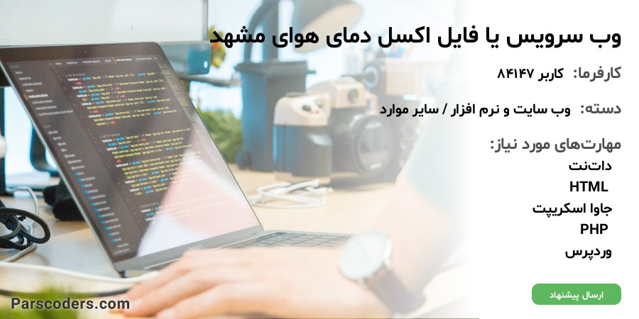 من نیاز به اطلاعات سابقه دما و ... آب و هوا شبیه سرویس یاهو دارم، مساله مهم اینه که من نیاز به داده های تاریخی دارم یعنی مثلا سال 93 تا 94 مشهد رو لازم دارم یا داده ها رو به فرمت اکسل یا csv در اختیار من قرار بدید و یا اینکه وب سرویسی در اختیارم قرار بدید(به همراه آموزش) که بتونم این داده ها رو بدست بیارم. ممنون در ضمن پروژه دانشجویی هست لطفا منصفانه قیمت بدید بودجه زیادی ندارم