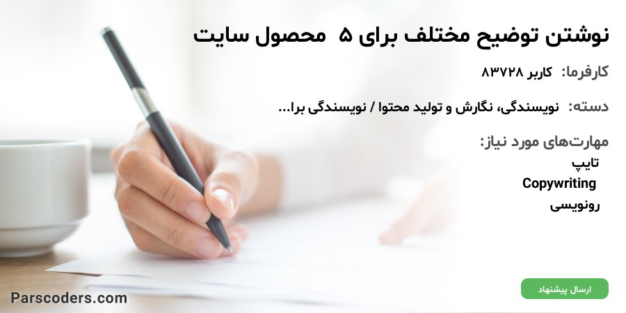 برای نمونه مشخصات و اگه لازم باشه عکس 5 کیف به پیشنهاد دهندگان ارسال خواهد شد...یعنی برای نمونه 5 متن کاملا مختلف 500 کلمه ای برای 5 محصول لازم هست، در صورت رضایت امکان ادامه همکاری برای محصولات بیشتر وجود داره و این پروژه برای نمونه هست.لطفا کسانی که انشا و نگارش قوی دارد و میتونن موضوع رو بسط بدن پیشنهاد بدن. متشکر