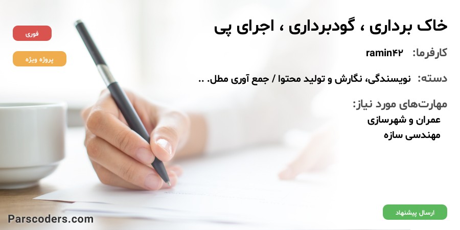 جمع آوری اطلاعات برای یک ارائه ی کلاسی مربوط به درس روش های اجرای ساختمان با موضوع خاک برداری ، گود برداری و اجرای پی که باید انواع ، تفاوت ها ، اولویت های استفاده بر اساس ضوابط آیین نامه ای و اجرایی و روش های انجام و اجرای هر کدام به صورت کامل و تفصیلی شرح داده شود.تاکید روی نکات و روش های اجرایی باشد نه روی مطالب تئوری.