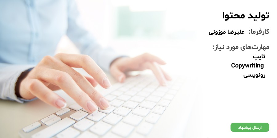 سلام خدمت دوستان من نیازمند یک نفر هستم که برای محصولات ما تولید محتوا انجام بده با قیمت مناسب بعد یه چیزی بگم ما برای هر محصول مون تولید محتوا 300 کلمه ای میخوایم حجم کارتون هم بستگی به تولید محصول ما در اون روز داره