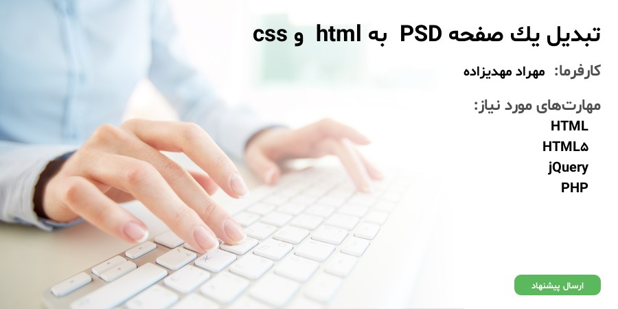 تبديل يک صفحه PSD به html و css بطوريکه فايل CSS و html توليد شده بايد تا حد امکان سبک و سريع و منطبق بر استانداردهاي W3 باشد و توسط validator هاي سايت w3.org بدون ايراد تاييد شود. ضمنا با همه مرورگرها از جمله IE6 سازگار باشد.