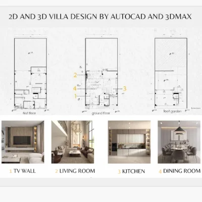وظایف: طراحی ویلا، محوطه، نما، پلان معماری و ساز ه