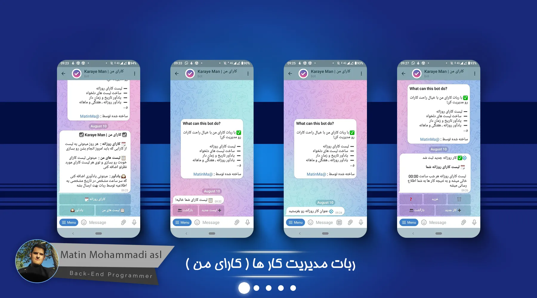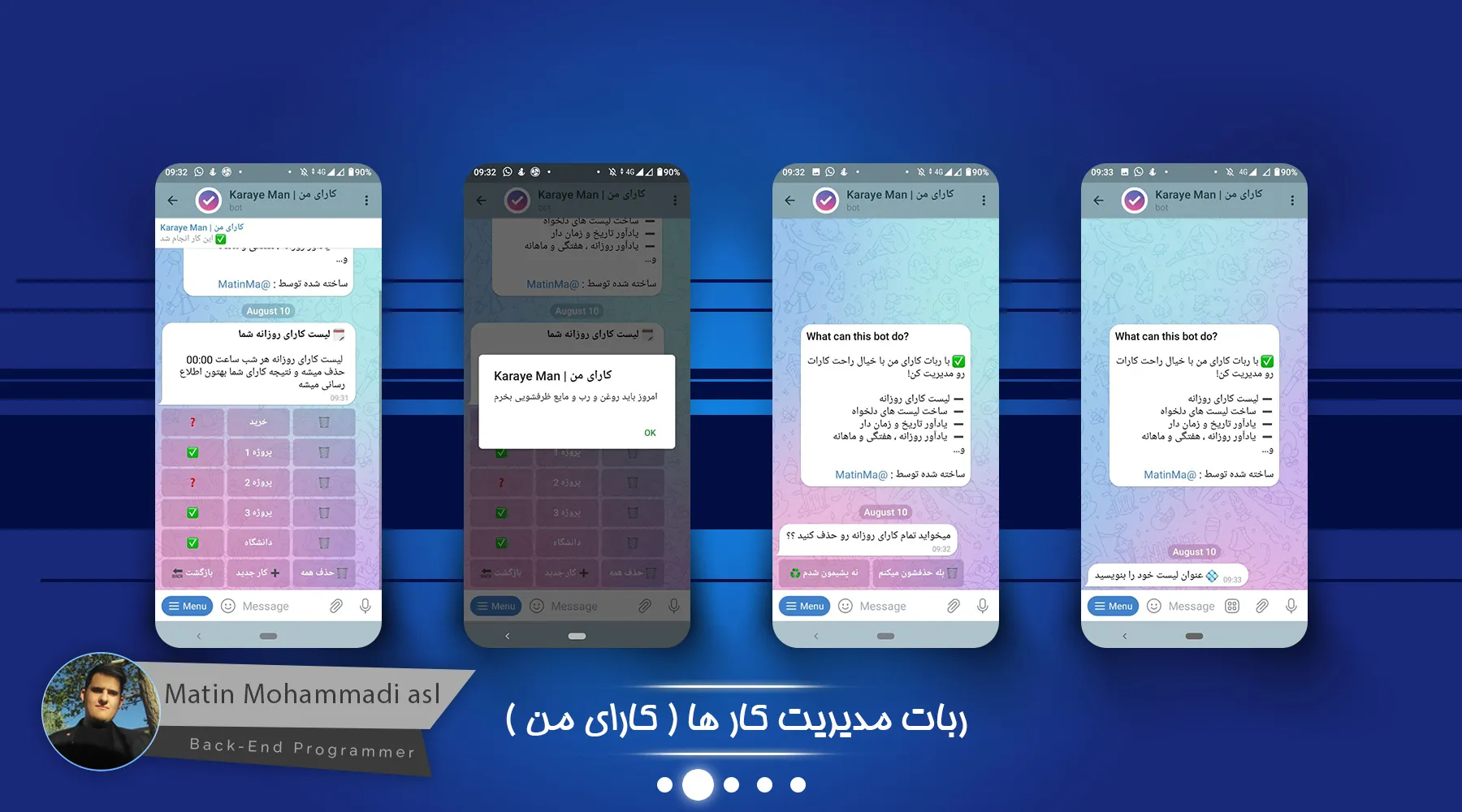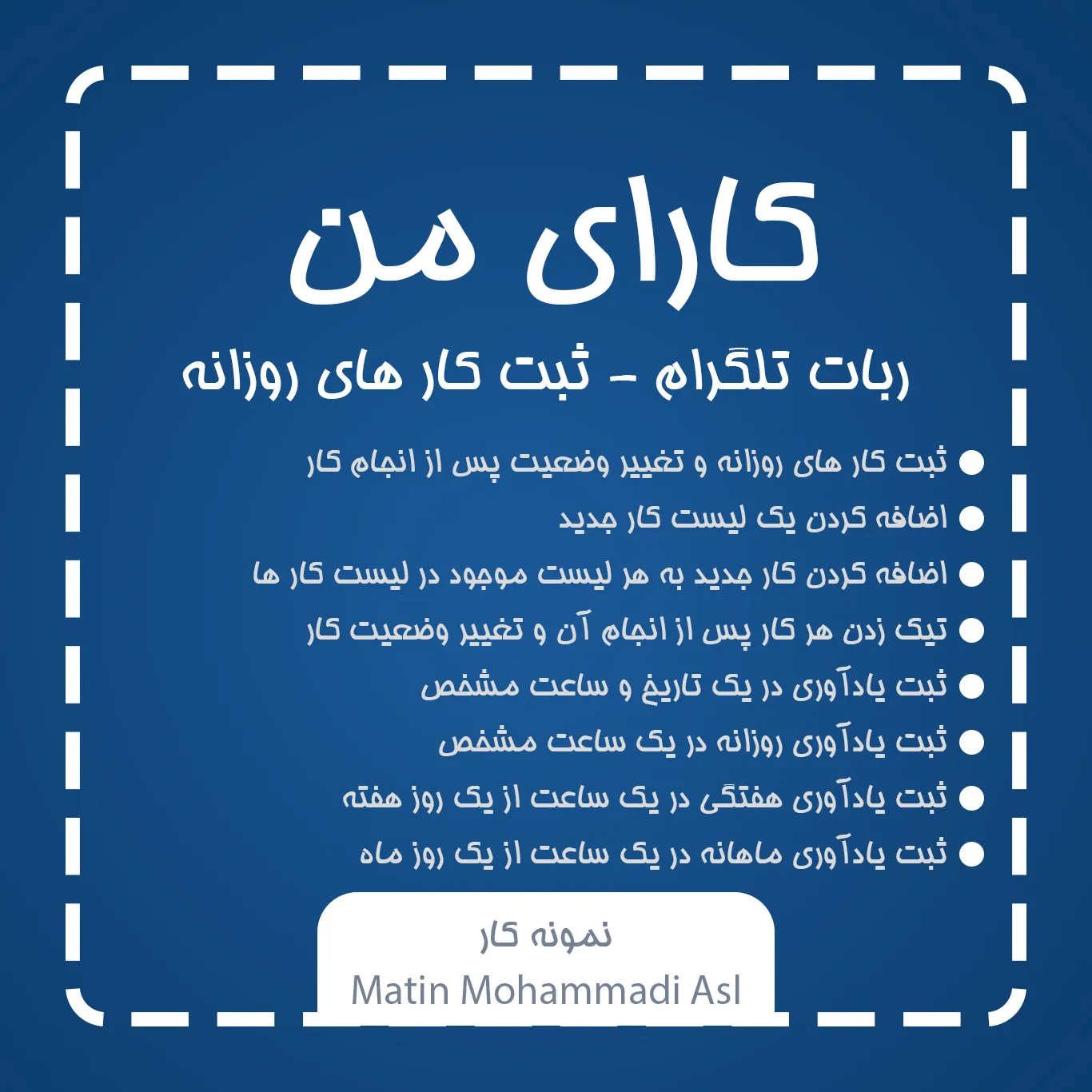 ربات کارای من یک ربات جهت مدیریت کار های روزانه و کارهای بلند مدت میباشد که مثل یک Todo List عمل میکند و میتوانید کار های انجام شده را تیک بزنید