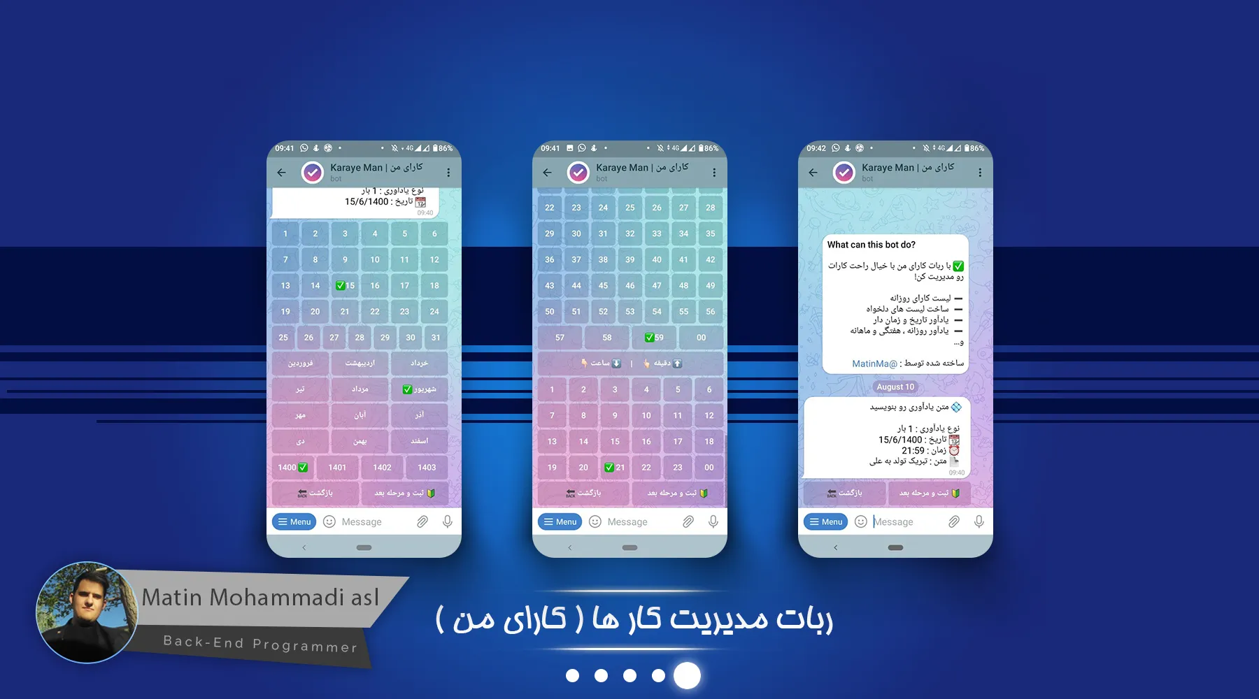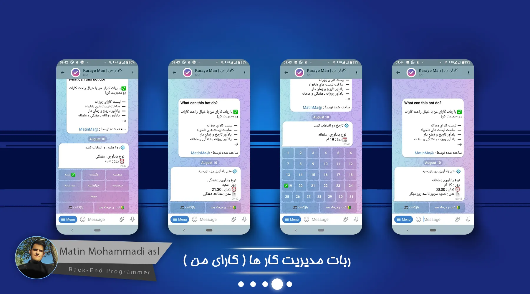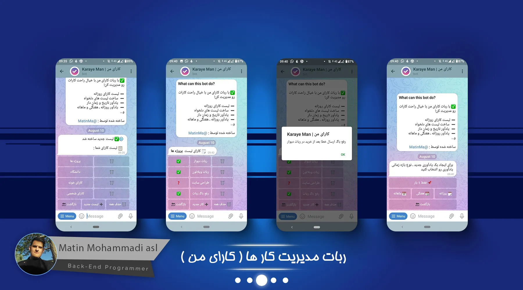 ربات کارای من یک ربات جهت مدیریت کار های روزانه و کارهای بلند مدت میباشد که مثل یک Todo List عمل میکند و میتوانید کار های انجام شده را تیک بزنید