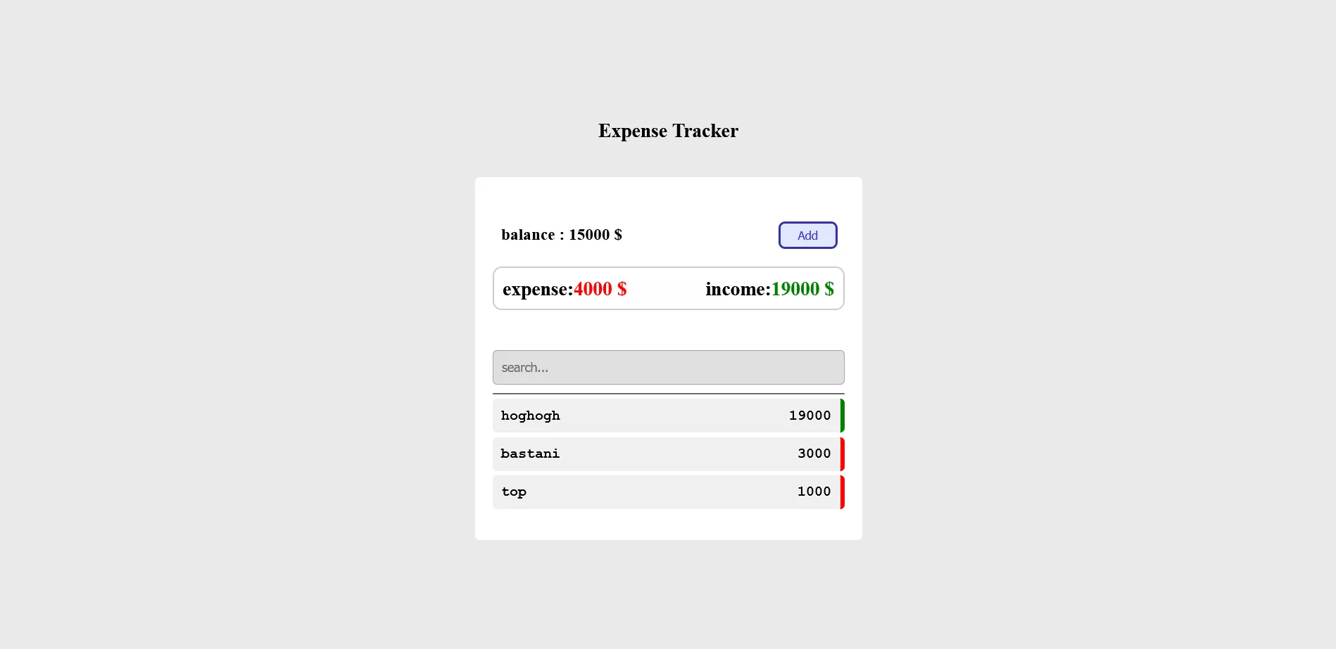 یه مینی پروژه محاسبه دخل و خرج با ریکت لینک دمو:https://alizabetpoor.github.io/expense-tracker/ لینک سورس پروژه:https://github.com/alizabetpoor/expense-tracker/tree/master