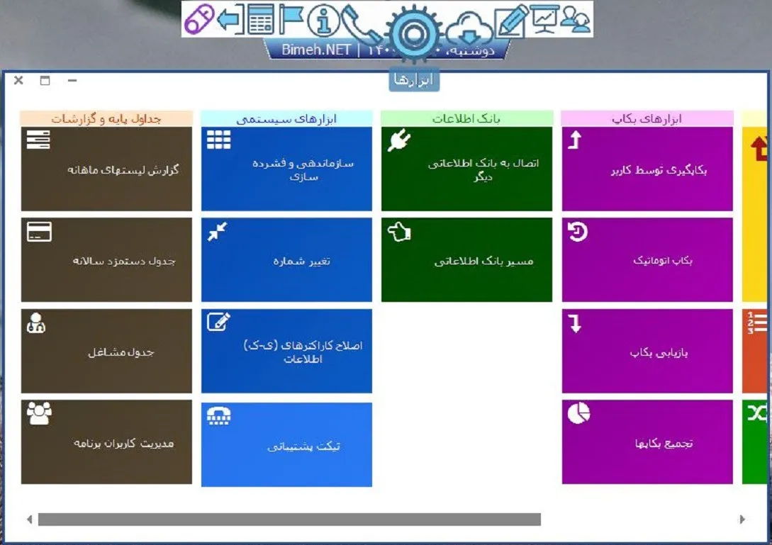 نرم افزار هوشمند بیمه که قابلیتها و امکانات متنوعی در آن برنامه نویسی و تولید شده و حدود 30000 خط کد در بخشهای مختلف آن نوشته شده است. 1- محیط طراحی و برنامه نویسی ویژوال اسودیو 2- گزارشات با استفاده از کریستال ریپورت طراحی شده 3- دیتابیس برنامه در د