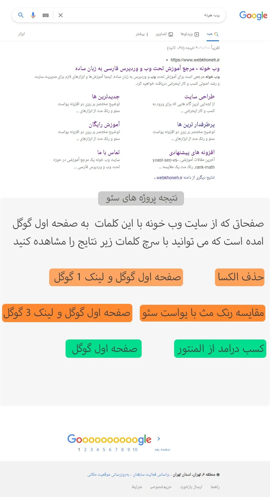 در حال حاظر سایت وب خونه با کلماتی که داخل عکس هم موجود است به صفحه اول گوگل امده است.
