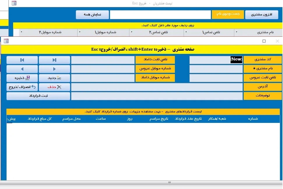 ثبت مشخصات مشتریان، صدور قرارداد، ارسال پیامک با اینترنت، گزارشات آماری و حسابداری
