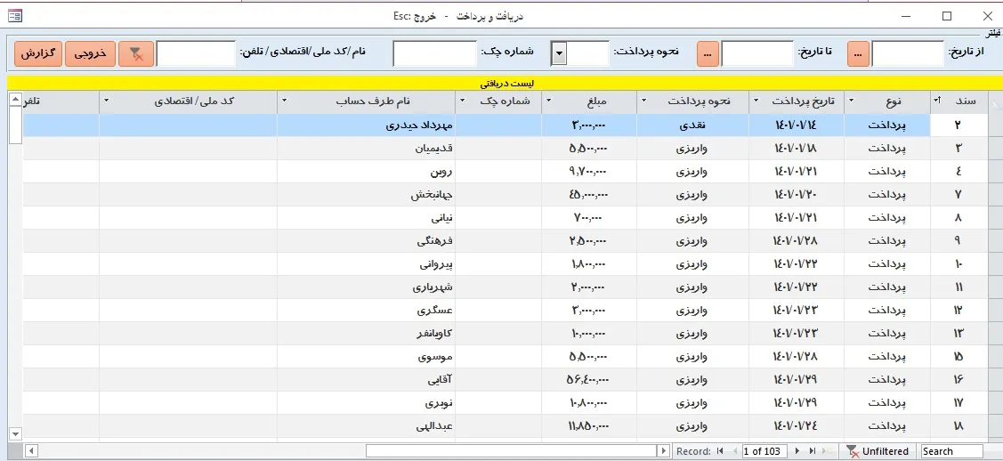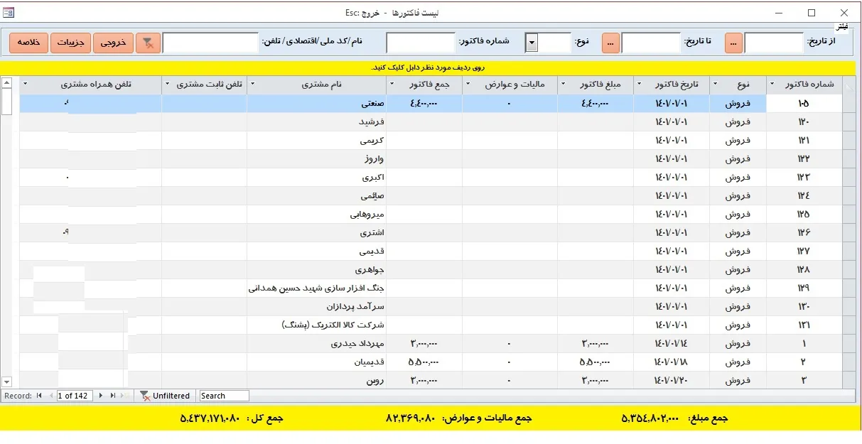 ثبت اطلاعات خرید و فروش کالا، دریافت و پرداخت، چک و گزارشات با امکان استفاده بصورت تحت شبکه و مالتی یوزر