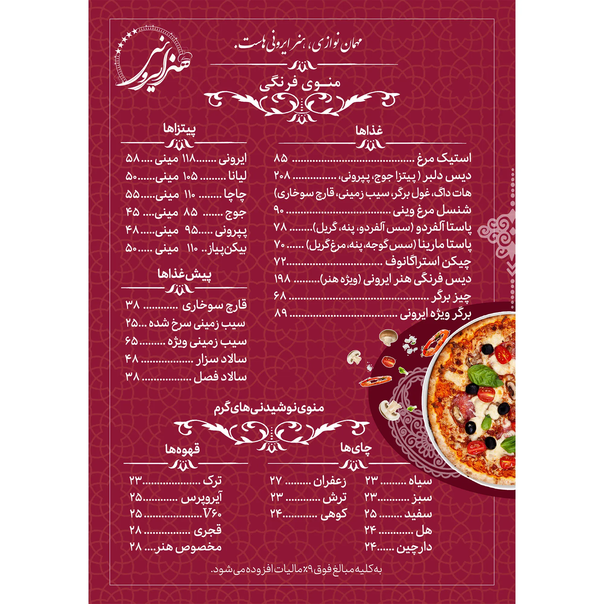 تصویر یک صفحه از منو رستوران هنر ایرونی مشهد که در بهار 1401 طراحی کردم.