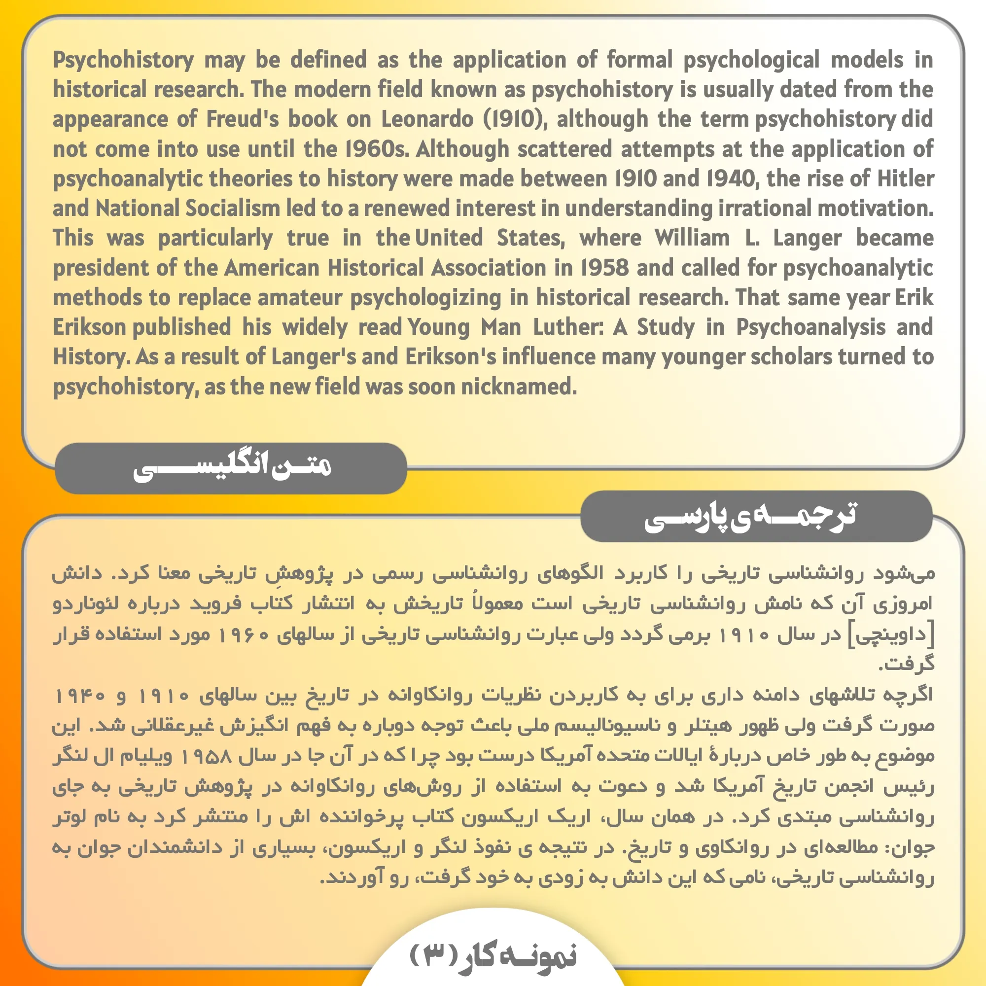 این ترجمة اینجانب از بخشی از وبسایت encyclopedia در بخش روانشناسی تاریخی است. متن کامل ترجمة اینجانب در وبسایت مورخان در بخش رونوشتها تحتِ عنوانِ روانشناسی تاریخی(psychohistory) قرار دارد.