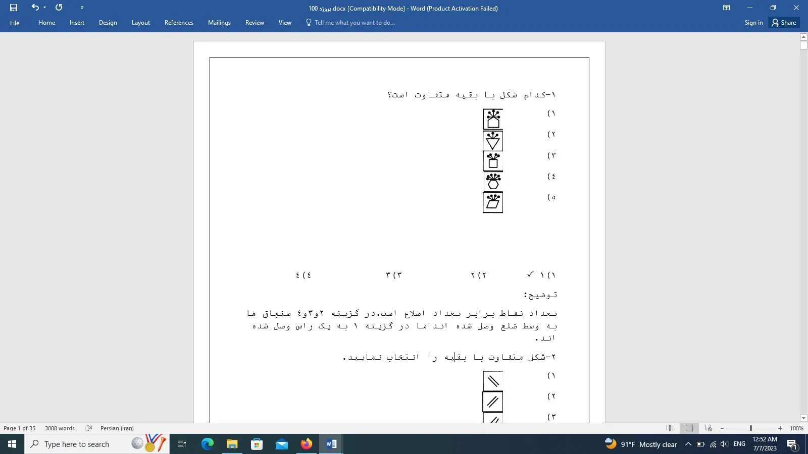 یک نمونه ترجمه تست های هوش ریاضی با برش عکس های مرتبط با گزینه ها و فونت نازنین