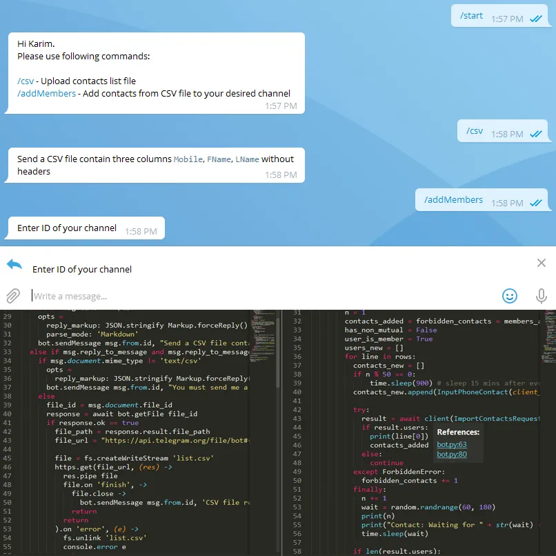 با استفاده از این ابزار که ترکیبی از کلاینت بات و بات تلگرام است میتوان فهرستی از شمارههای موبایل را با به کارگیری سازوکاری امن و غیراسپم به کانال تلگرام دعوت نمود.
