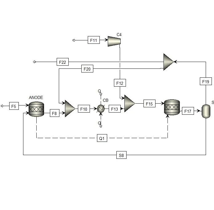 در این شبیه سازی بطور مختصر و مفید H2 را به CO2 تبدیل نموده و جریان الکتریکی را به عنوان محصول جمع آوری میکنیم. شبیه سازی در Aspen + این توانایی را به ما میدهد تا نتایج شبیه سازی نسبت به Aspen hysys دقیق تری را داشته باشیم.