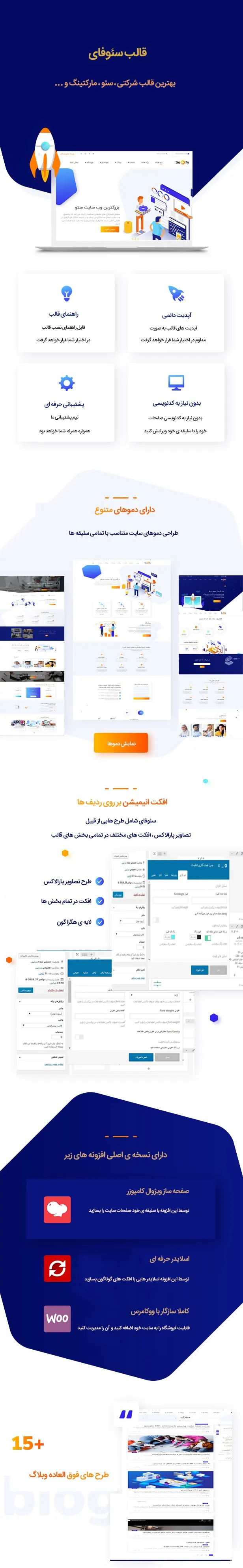 قالب سئوفای قالبی فوق العاده زیبا، حرفه ای و کاربر پسند میباشد که دارای دموهای مختلف میباشد. از ویژگی های مهم این قالب میتوان به طراحی مدرن شاره کرد.تیم ما این قالب را فارسی سازی و بومی سازی کرده امکاناتی همچون شمسی سازی به آن اضافه شده است