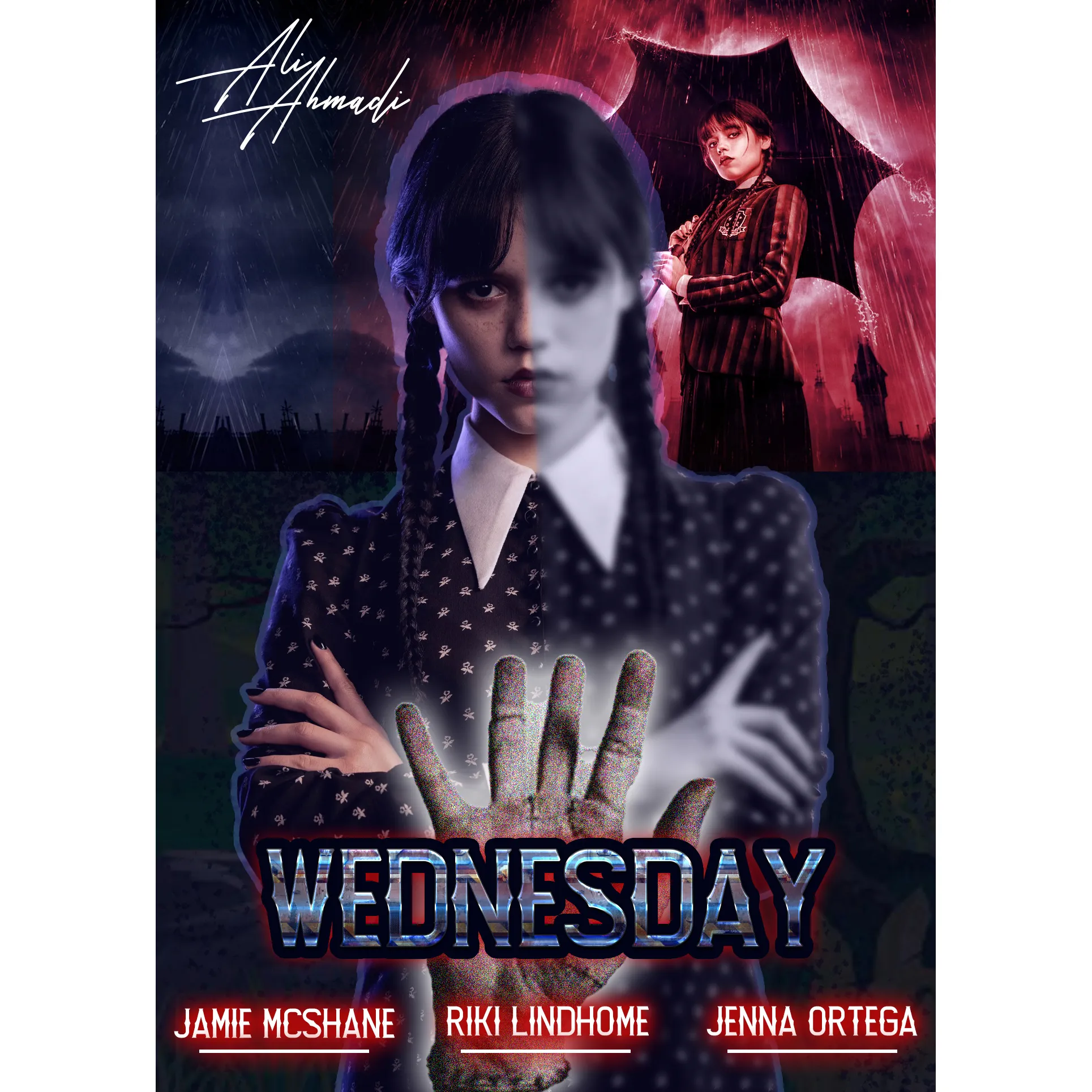طراحی پوستر تبلیغاتی سریال WEDNESDAY با استفاده از نرم افزار فتوشاپ