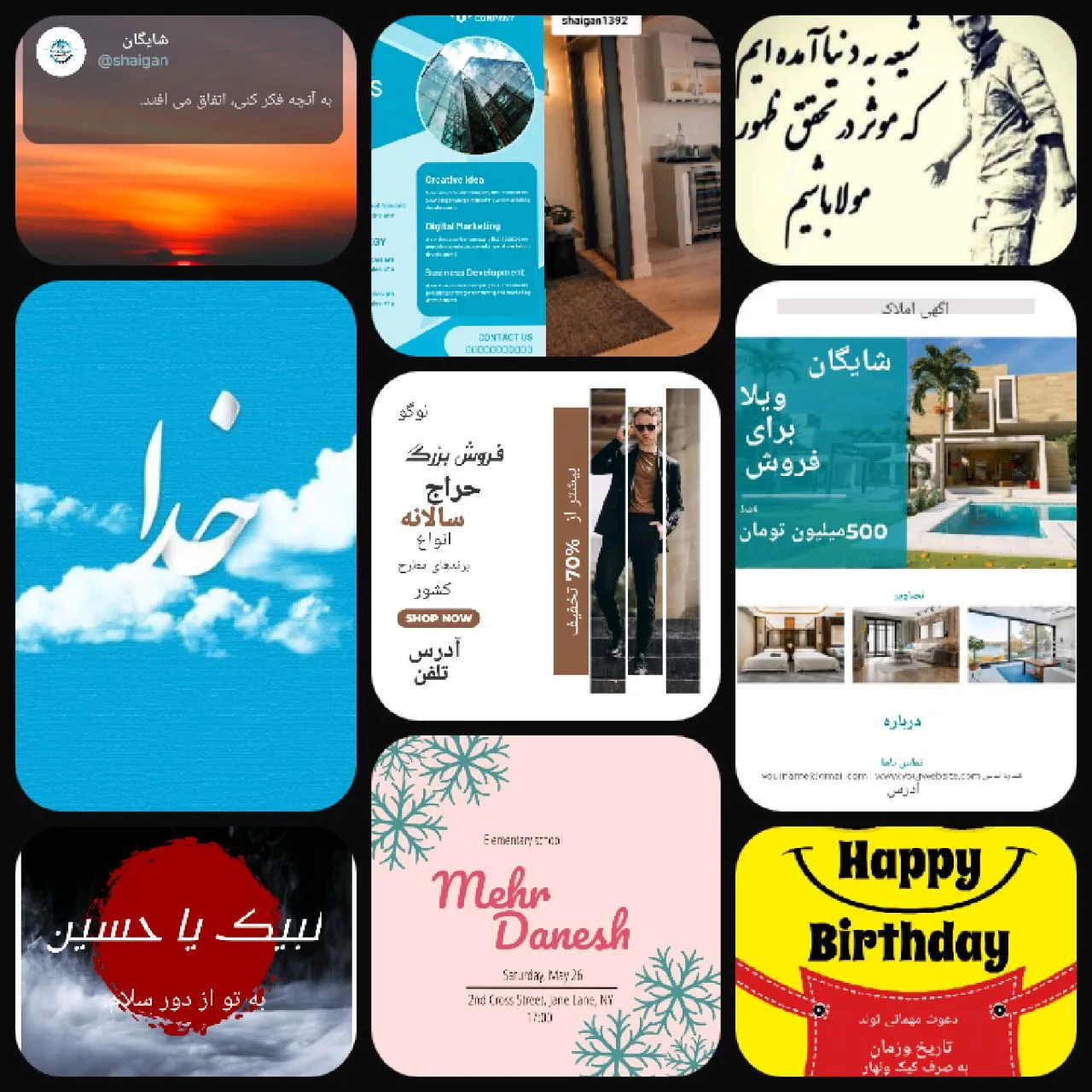 طراحی وساخت پوستر. بنر. پست اینستاگرام وکارت دعوت تولد وعروسی. وپوستر مذهبی وطرح روی ماگ. گیفت کارت