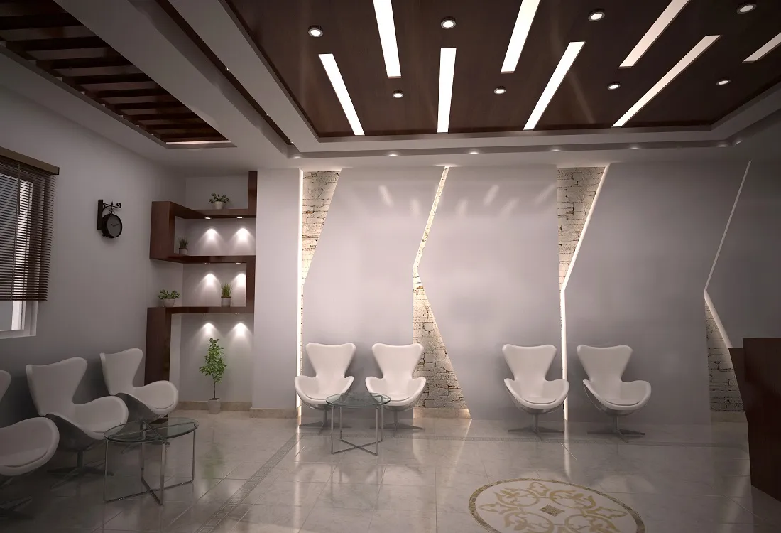 طراحی داخلی مدرن مطب پزشک که بعد از اجرای کف و سقف و دیوارها طراحی برای فضا انجام گرفته.