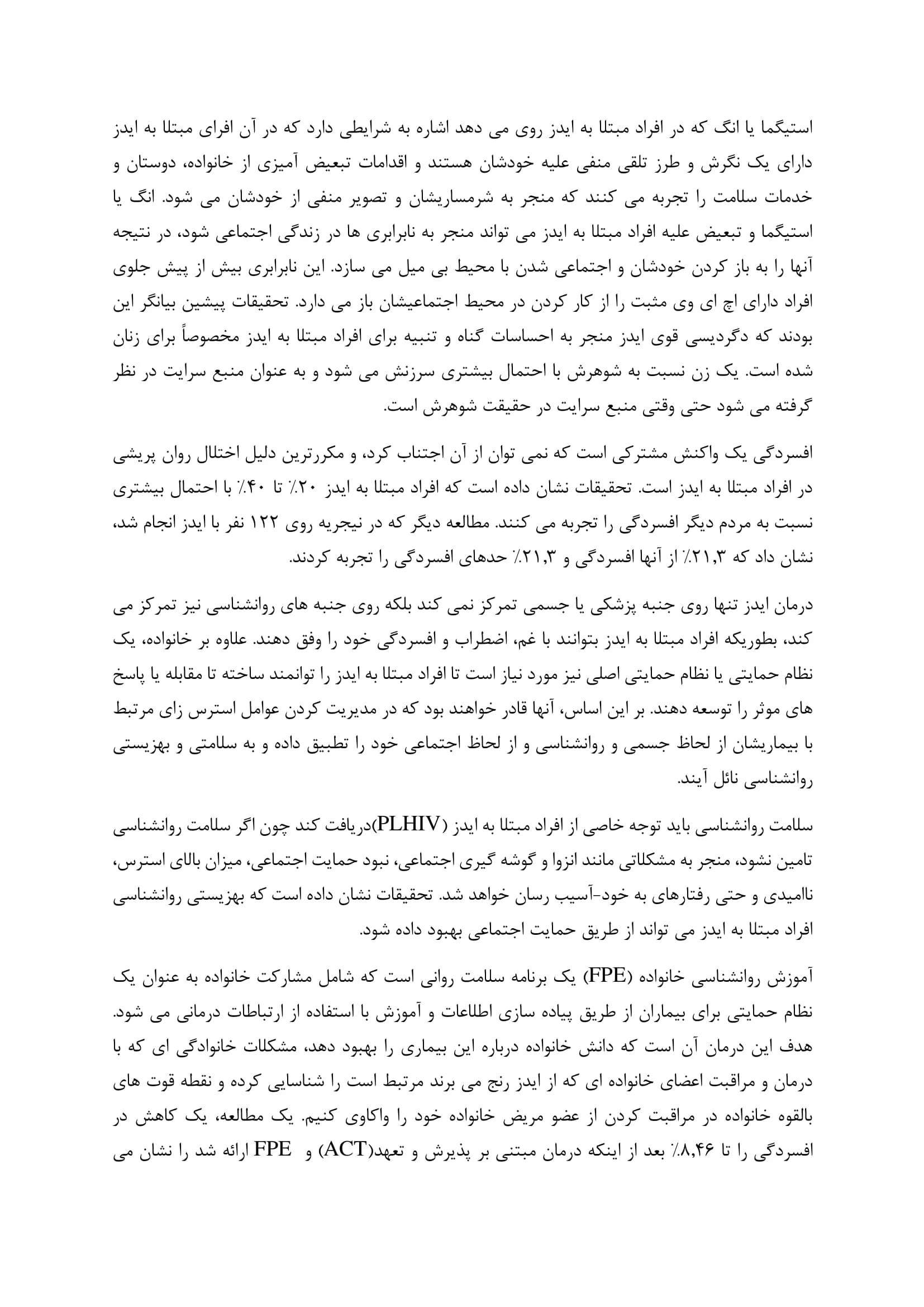 عنوان مقاله :تاثیر آرم-درمانی، درمان مبتنی بر پذیرش و تعهد، آموزش روانشناسی خانواده روی انگ بر خود و افسردگی در بانوان خانه دار مبتلا به ایدز که صفحه دوم ترجمه شده این مقاله بصورت عکس ضمیمه شده است.