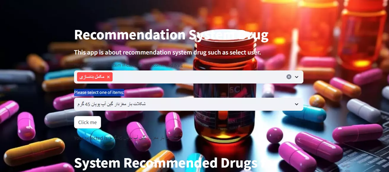 این پروژه را با زبان برنامه نویسی پایتون نوشتم و در قالب تحت وب استریملیت و جنگو پیاده سازی کردم. هدف این پروژه پیاده سازی سیستم توصیه گر دارو مبتنی بر محتوا می باشد. کار به این صورت است که ابتدا من داده های مرتبط با دارو را از وب جمع آوری کردم. سپس در دیتابیس ریختم. سپس به تمیزکاری داده ها پرداختم. از محتوای دارو برای توصیه به کاربران استفاده کردم. کاربر هم می تواند داروی مورد نظر خود را جست و جو کند و هم می تواند دسته های مرتبط با دارو را انتخاب کند و دکمه را کلیک کند تا دارو به وی پیشنهاد گردد.